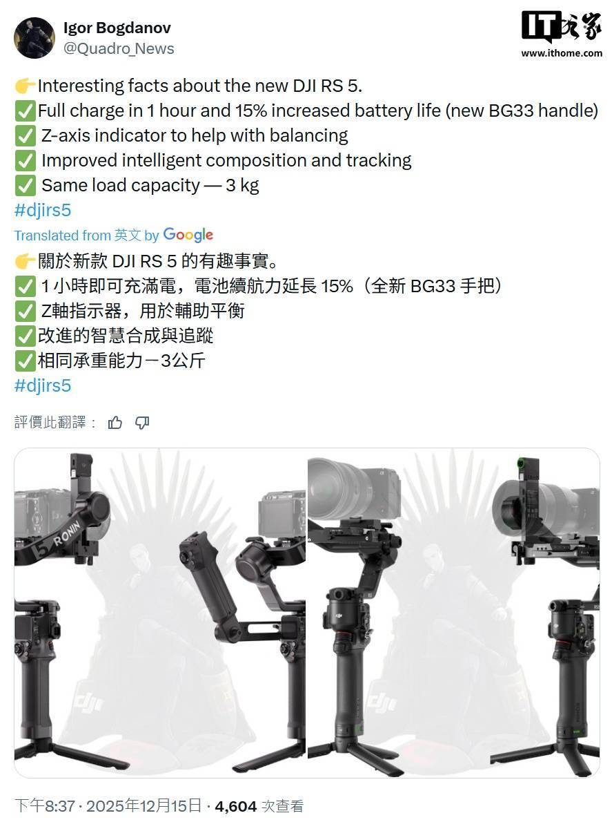 IT之家 12 月 16 日消息,消息人士Igor Bogdanov 昨天在 X 平台发文,曝光大疆 RS5 相机稳定器的渲染图。