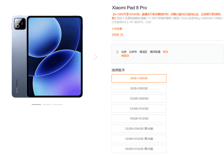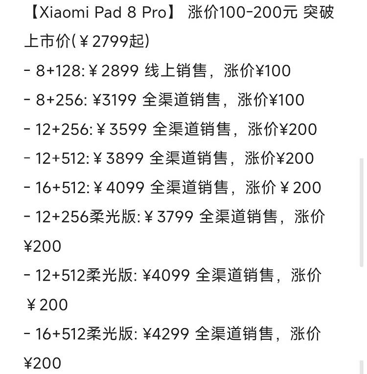 以今年发布的小米Pad 8系列为例,其中小米Pad 8涨价100-200元,其中8+128GB、8+256GB均涨价100元,现售价格分别为2299元、2599元,而更高运行内存版本的12+256GB价格上调200元,现售价格2999元。