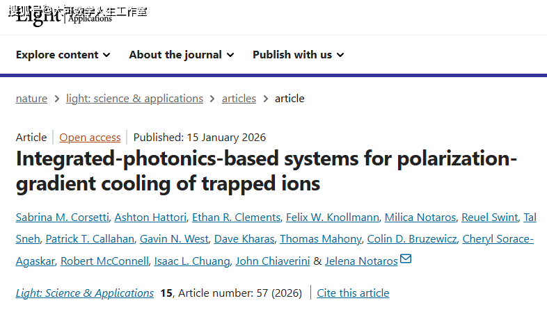 2026年1月15日,国际顶级期刊《Light: Science & Applications》发表了一项量子技术领域的重要进展——来自麻省理工学院、美国国家标准与技术研究院等机构的联合团队,成功开发出基于集成光子学的偏振梯度冷却系统,为被困离子实现了更高效的激光冷却,这一成果将为量子计算的实用化扫除关键障碍。