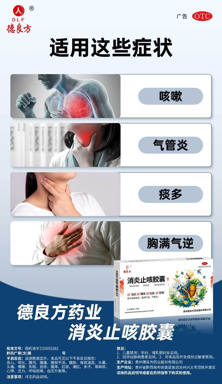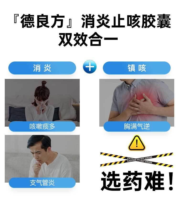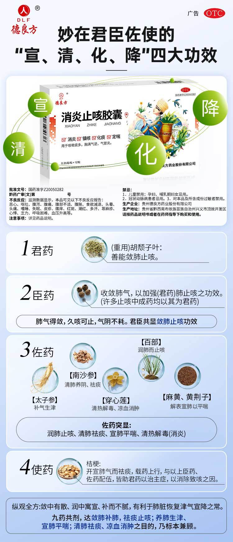 与市面上多数单一功效的止咳药不同,德良方消炎止咳胶囊是经母公司贵州德良方药业自主研发的中药新药,实现了消炎+镇咳+化痰+平喘四效合一,这一特点源于其严谨的九味中药组方:胡颓子叶、桔梗宣肺祛痰,百部、罂粟壳调节咳嗽中枢抑制干咳,麻黄碱松弛支气管平滑肌缓解喘息,穿心莲则发挥清热解毒的抗炎作用——针对风寒、风热、燥邪、痰热等多种类型的咳嗽,以及支气管炎引发的胸满气逆,无需搭配多种药物,就能一站式解决呼吸道问题。这种多效协同的设计,不仅降低了消费者的用药复杂度,也让基层药店推荐时更有针对性,尤其适合感冒后期咳嗽迁延不愈、需要同时控制炎症和排痰的用户。