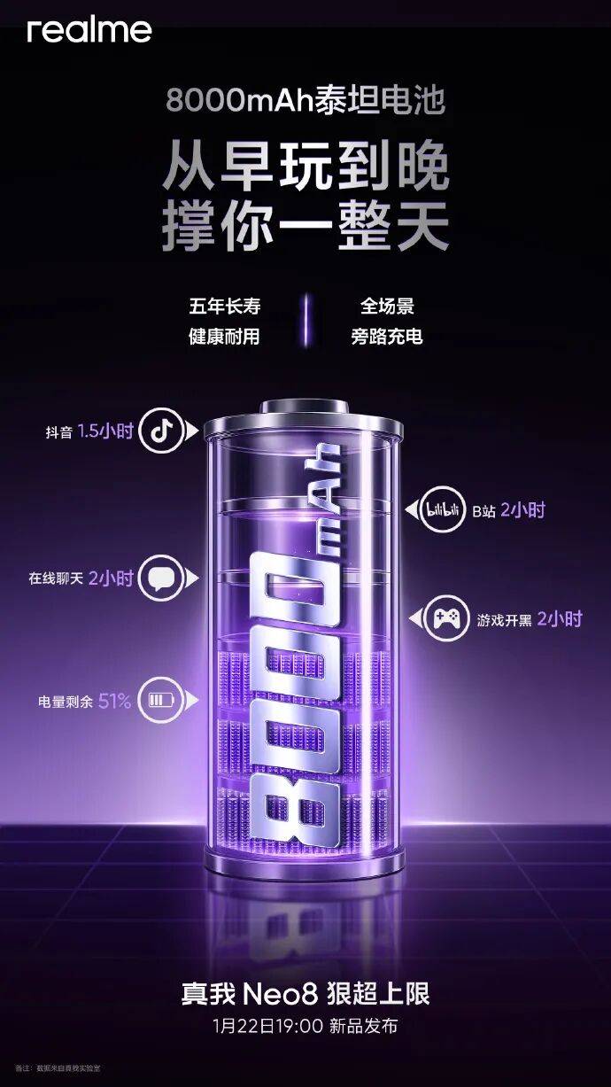 真我Neo8离1月22日发布越来越近,官方又放了个关键信息——选了单层主板结构,还成功容纳8000mAh泰坦电池,比同类型单层主板性能机型多了1000mAh容量。在中端机里,单层主板多为保障性能释放和散热设计,大电池则需要更多空间,这两项需求本存在一定矛盾,真我这次通过设计优化实现了兼顾。结合已曝光的配置和行业常规表现来看,这波操作诚意尚可,但细节里的取舍也很实在,咱们顺着官方爆料和数码圈信息慢慢捋。