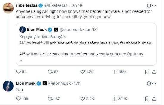 另一位网友评论称:“任何正在使用 AI4 的人都清楚,对于无监督的驾驶而言,更好的硬件并非必需。目前它的表现已经非常出色了。”