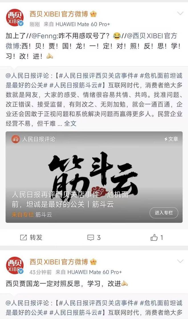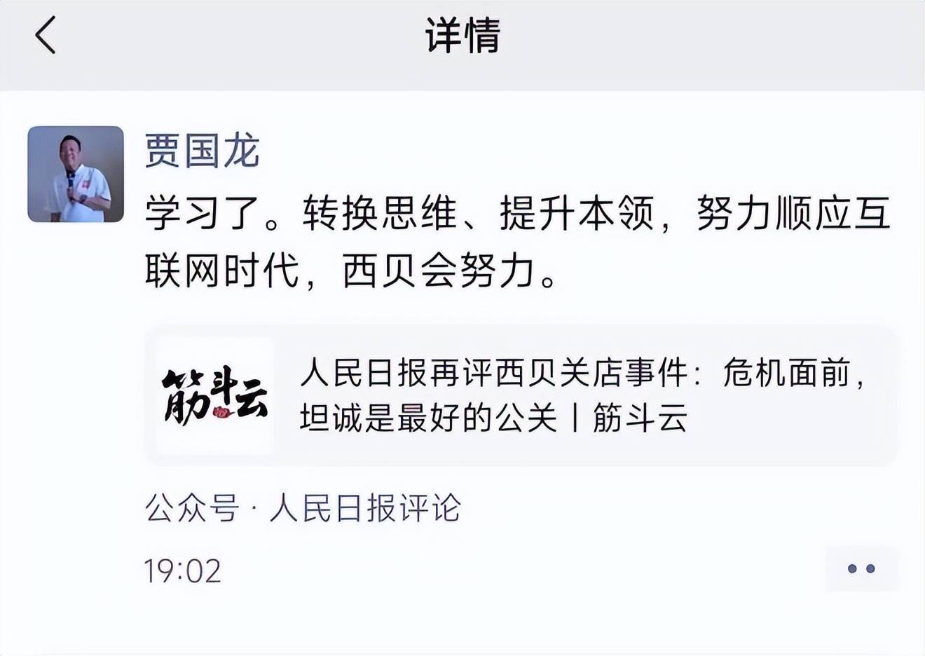 这场风波也引来的两度重磅点评。1 月 18 日,发布《网络舆论环境不能成为企业发展的短板》,贾国龙第一时间转发到朋友圈,配文 “相信组织,依靠法律,团结伙伴,一万七千名西贝人全力以赴自救”,试图传递信心。