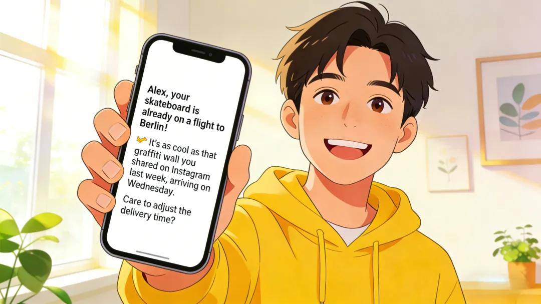 物流追踪场景:“Alex, your skateboard is already on a flight to Berlin! ✈️ It's as cool as that graffiti wall you shared on Instagram last week, arriving on Wednesday. Care to adjust the delivery time?”——将物流更新与顾客社交动态结合,创造个性化关联。