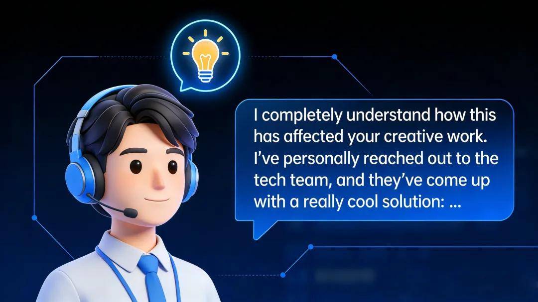 问题解决场景:当顾客遇到技术问题时,“I completely understand how this has affected your creative work. I’ve personally reached out to the tech team, and they’ve come up with a really cool solution: ...”——使用积极词汇表达共情,强调个人责任感和解决方案的价值。