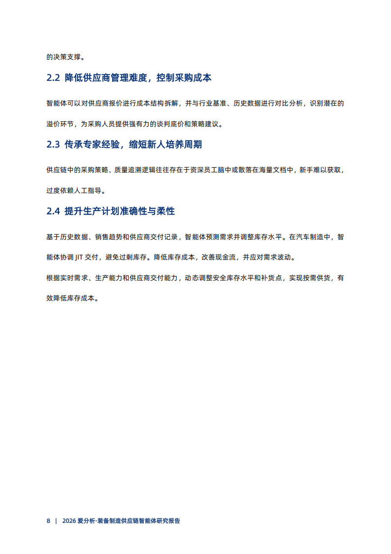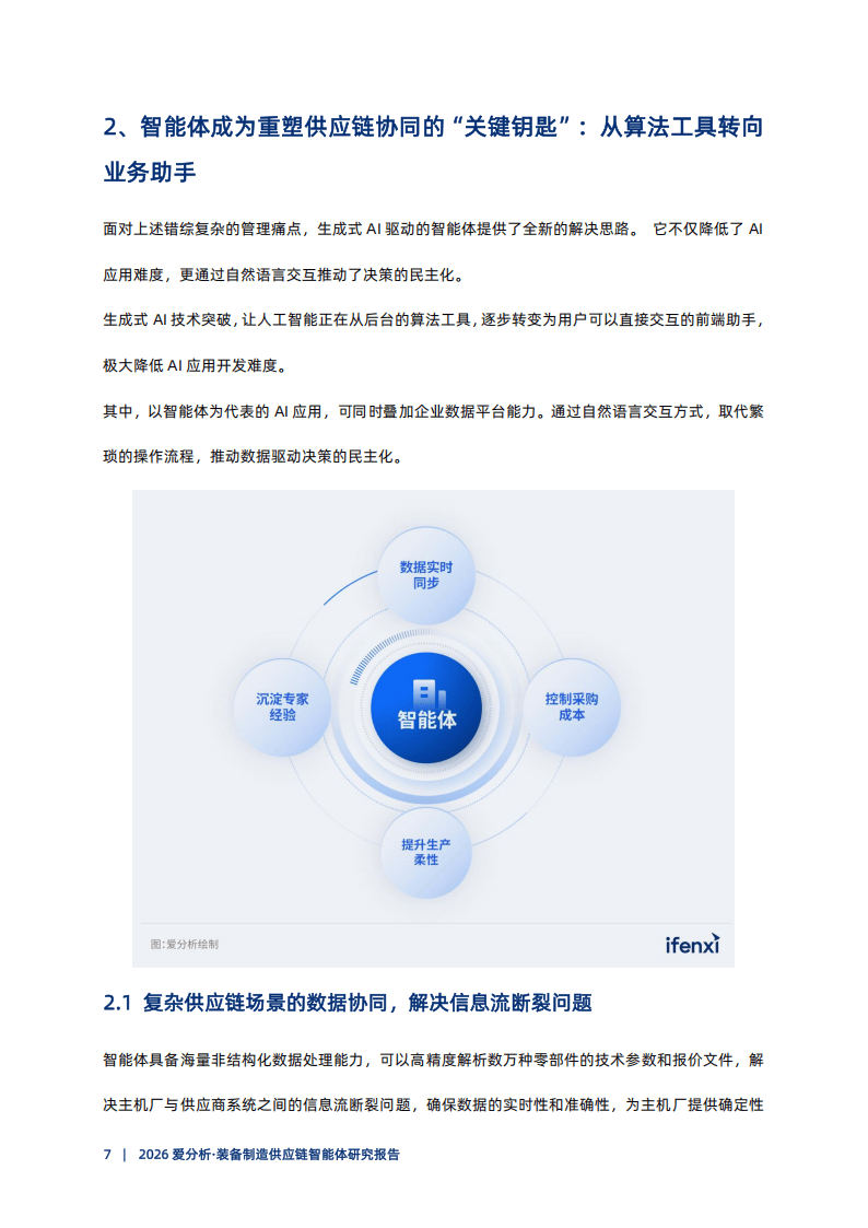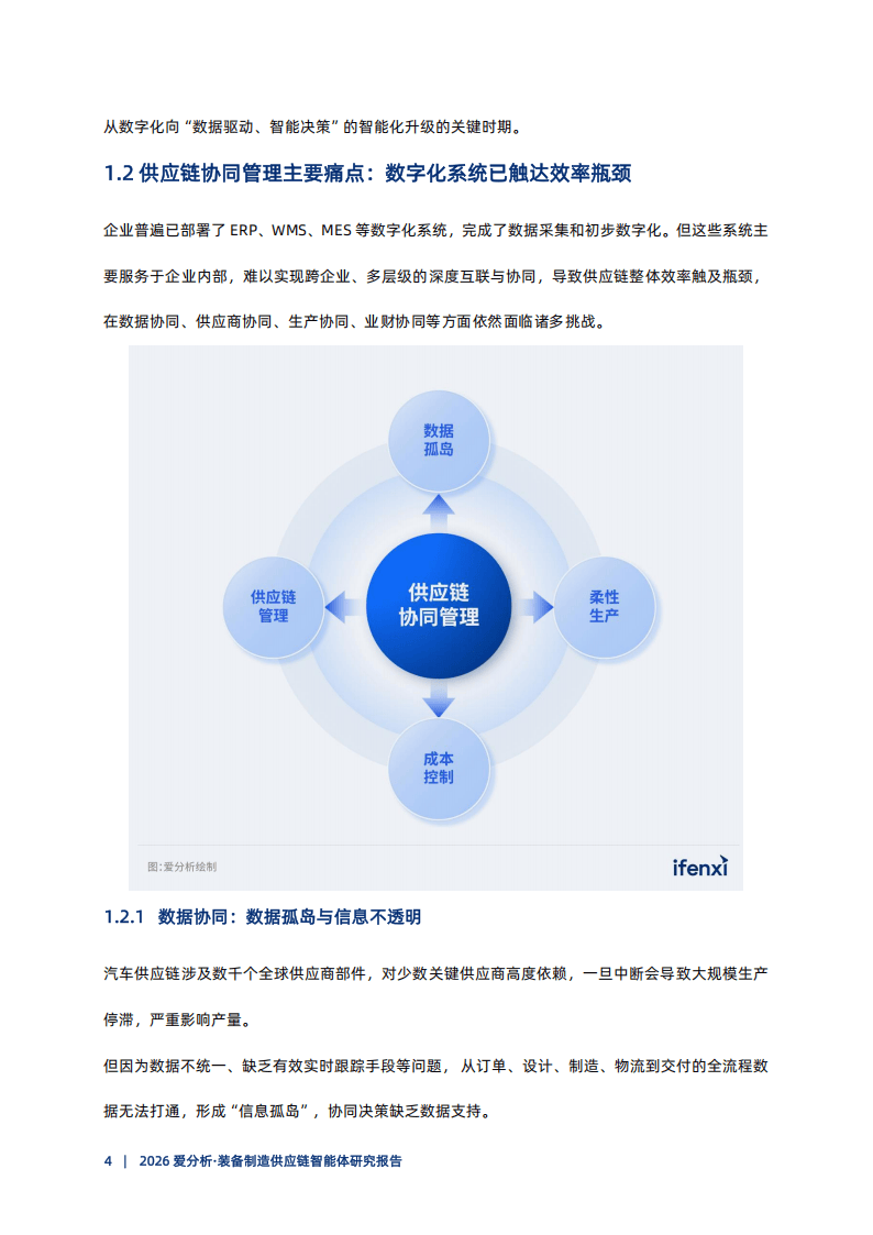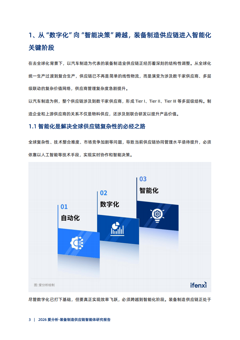 《2026爱分析·装备制造供应链智能体研究报告》指出,在去全球化背景下,以汽车制造为代表的装备制造业供应链已从线性物流演变为涉及数千家供应商的复杂价值网络,智能化成为解决供应链复杂性的必经之路,行业正从“数字化”向“数据驱动、智能决策”的关键阶段跨越。