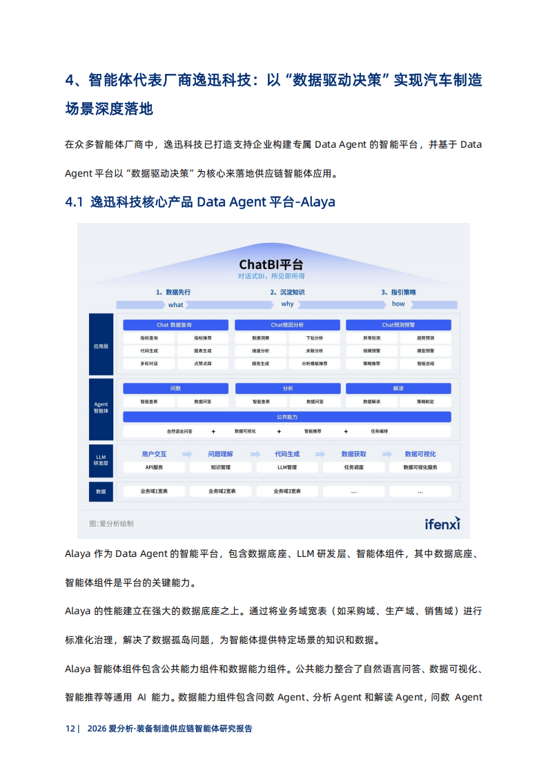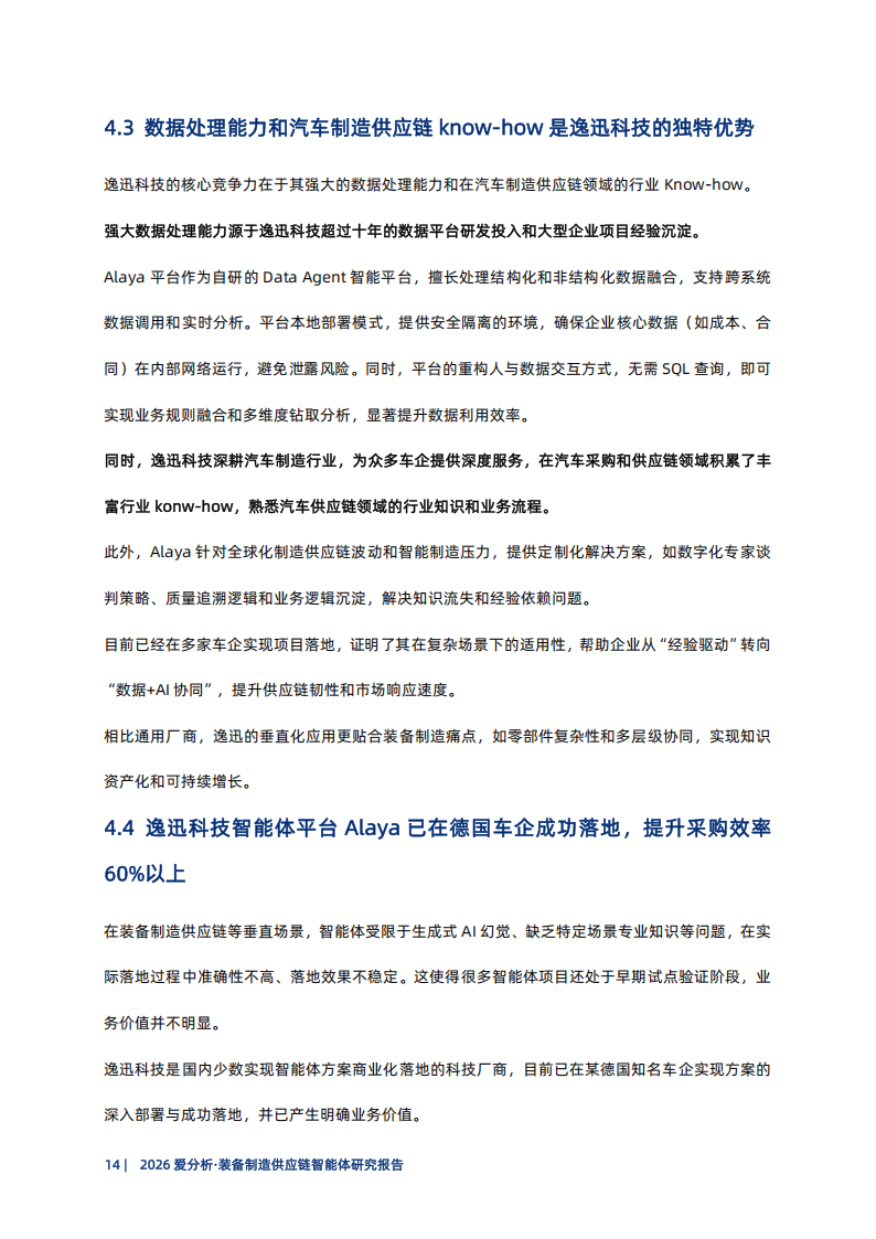 智能体市场主要有四类厂商,各有优劣。其中,数据智能厂商凭借强大的数据处理能力、AI工程化能力及行业经验脱颖而出,逸迅科技作为代表厂商,其核心产品Alaya平台通过数据底座、LLM研发层和智能体组件,构建了“数据先行、沉淀知识、指引策略”的供应链智能体应用,在采购管理、供应商管理、知识管理等场景深度落地,已在德国知名车企成功部署,使采购效率提升60%以上,潜在成本节约机会提升5-8%。