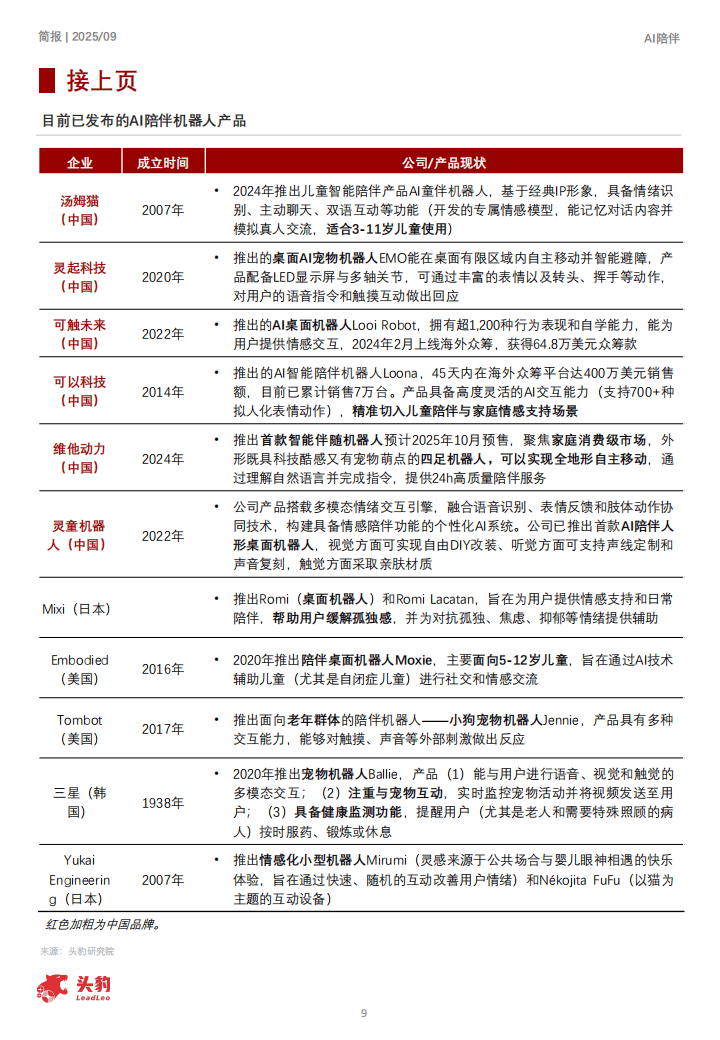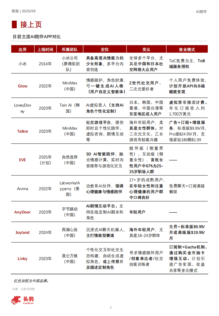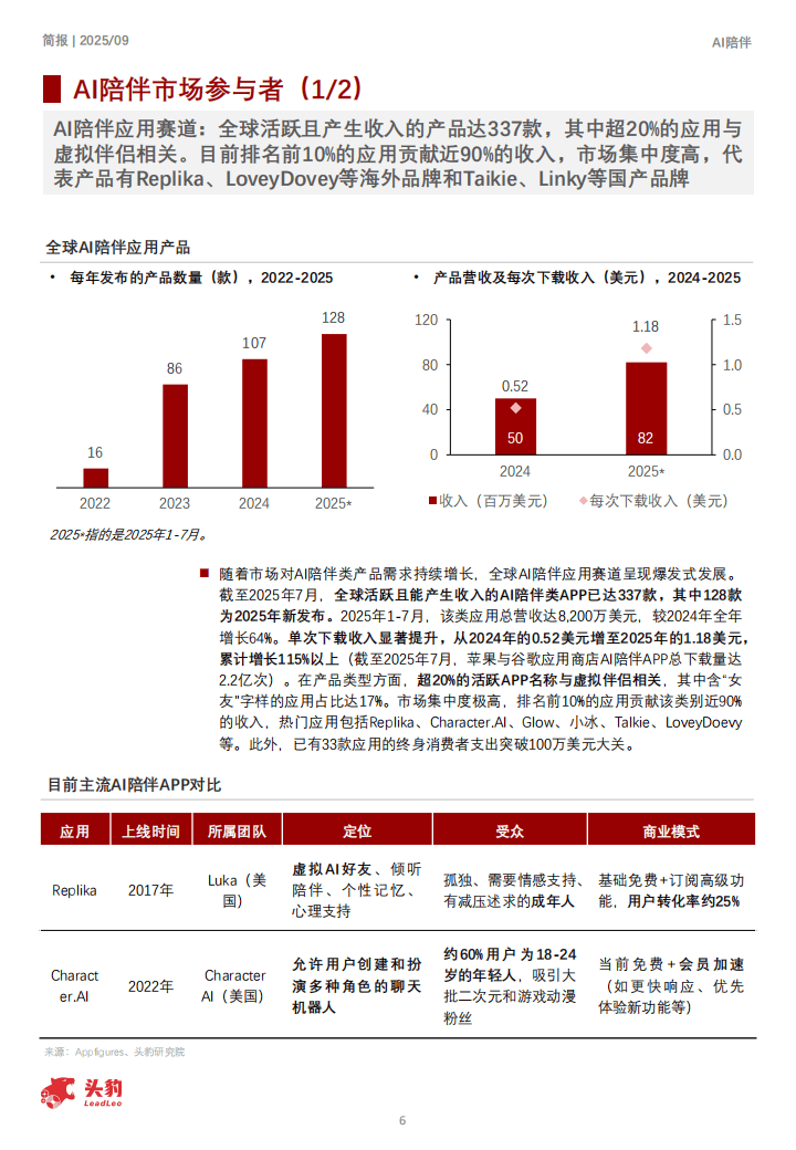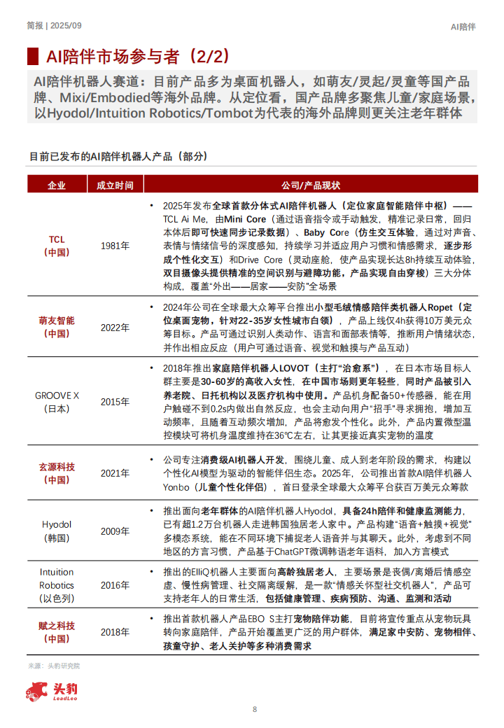 行业参与者方面,AI陪伴应用赛道与机器人赛道齐头并进。全球活跃且产生收入的AI陪伴应用达337款,2025年1-7月总营收达8200万美元,较2024年全年增长64%,市场集中度高,前10%的应用贡献近90%收入,代表产品包括Replika、Character.AI等海外品牌及小冰、Glow等国产品牌。机器人赛道中,国产品牌多聚焦儿童与家庭场景,如汤姆猫的AI童伴机器人、可以科技的Loona等;海外品牌则侧重老年群体,如以色列的ElliQ、美国的Tombot等。
