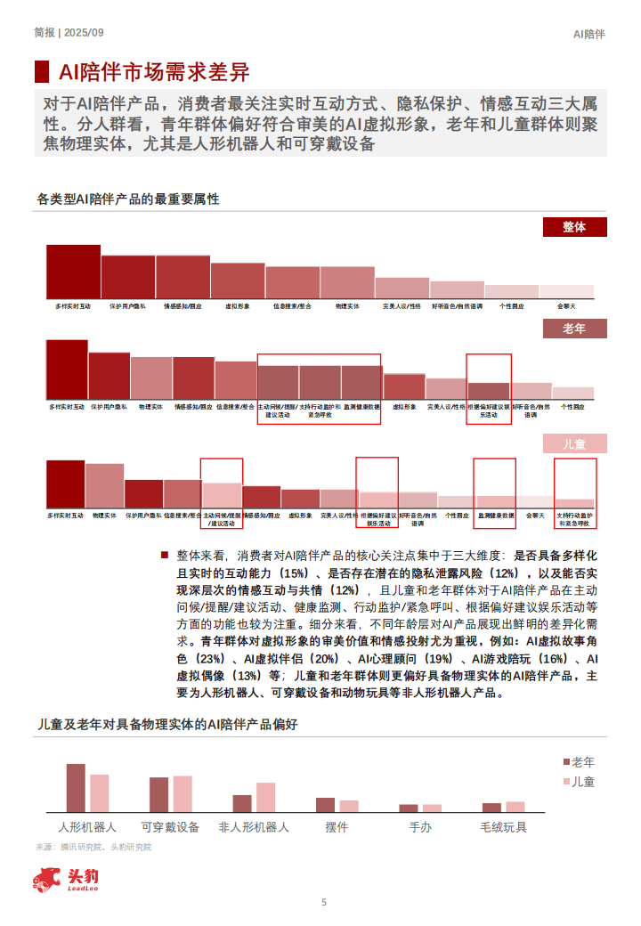 市场需求呈现鲜明的人群差异。整体来看,消费者最关注实时互动、隐私保护和情感互动三大属性。青年群体偏好具备审美价值的AI虚拟形象,如虚拟伴侣、心理顾问、游戏陪玩等;儿童和老年群体则更青睐人形机器人、可穿戴设备等物理实体产品,且注重健康监测、行动监护、主动提醒等功能。