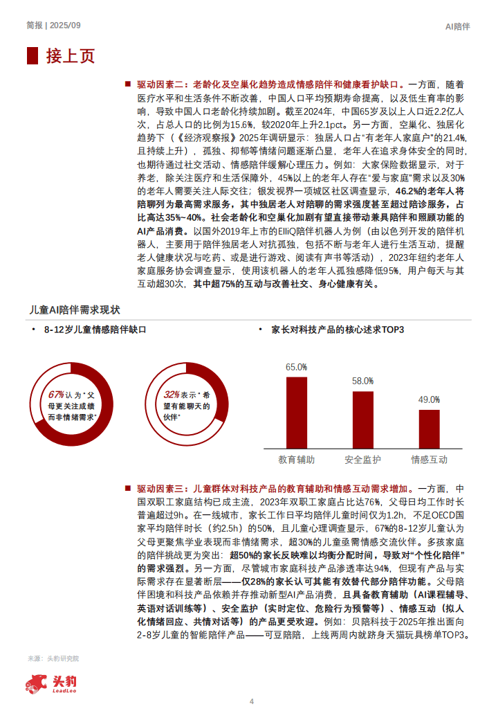 人口老龄化与空巢化趋势进一步扩大了市场需求,截至2024年,中国65岁及以上人口近2.2亿人,占总人口15.6%,独居人口占“有老年人家庭户”的21.4%,46.2%的老年人将陪聊列为最高需求服务。同时,双职工家庭成为主流,76%的双职工家庭中家长日均工作超9小时,一线城市家长工作日平均陪伴儿童时间仅1.2小时,67%的8-12岁儿童认为父母更关注成绩,超30%亟需情感交流伙伴,催生了儿童群体对教育辅助与情感互动类AI产品的需求。