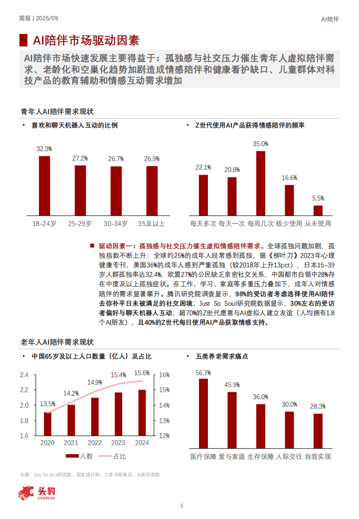 AI陪伴行业正从单一工具属性向情感交互生态快速跃迁,其发展主要受三大核心因素驱动。全球孤独问题加剧与社交压力增大,让虚拟情感陪伴需求持续攀升,全球约25%的成年人经常感到孤独,中国都市白领中28%存在中度及以上孤独症状,98%的受访者考虑使用AI陪伴弥补社交困境,超70%的Z世代愿意与AI虚拟人建立友谊。