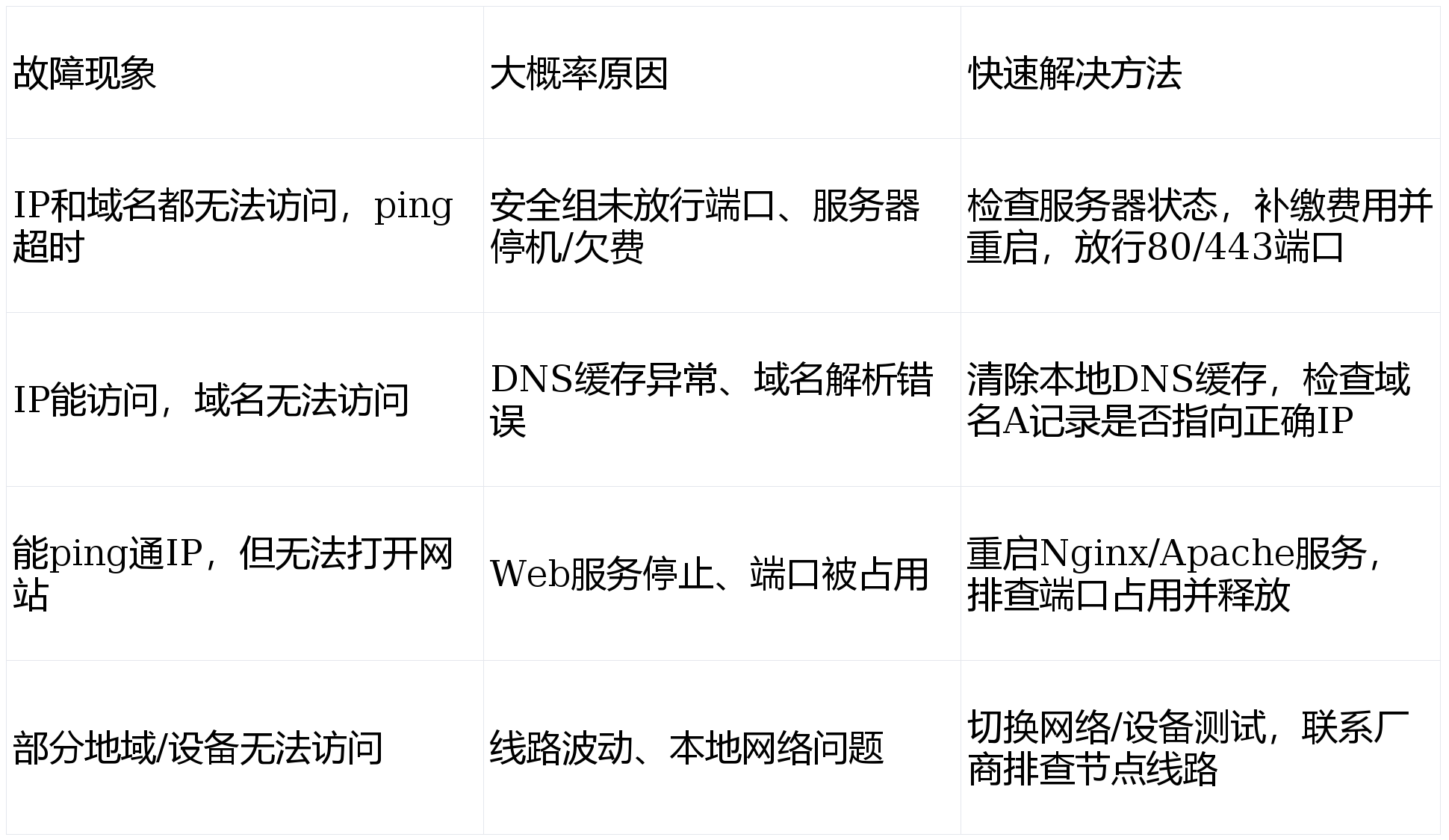无论是搭建网站、运行小程序还是部署项目,云服务器突然无法访问都是最让人头疼的问题——既可能是简单的配置失误,也可能是底层网络故障。很多新手遇到这类问题会手足无措,盲目重启反而可能扩大故障。本文结合阿里云、腾讯云、京东云实测经验,整理出“先定位范围→再分层排查”的全流程教程,覆盖90%常见故障场景,步骤清晰、新手可直接对照操作。