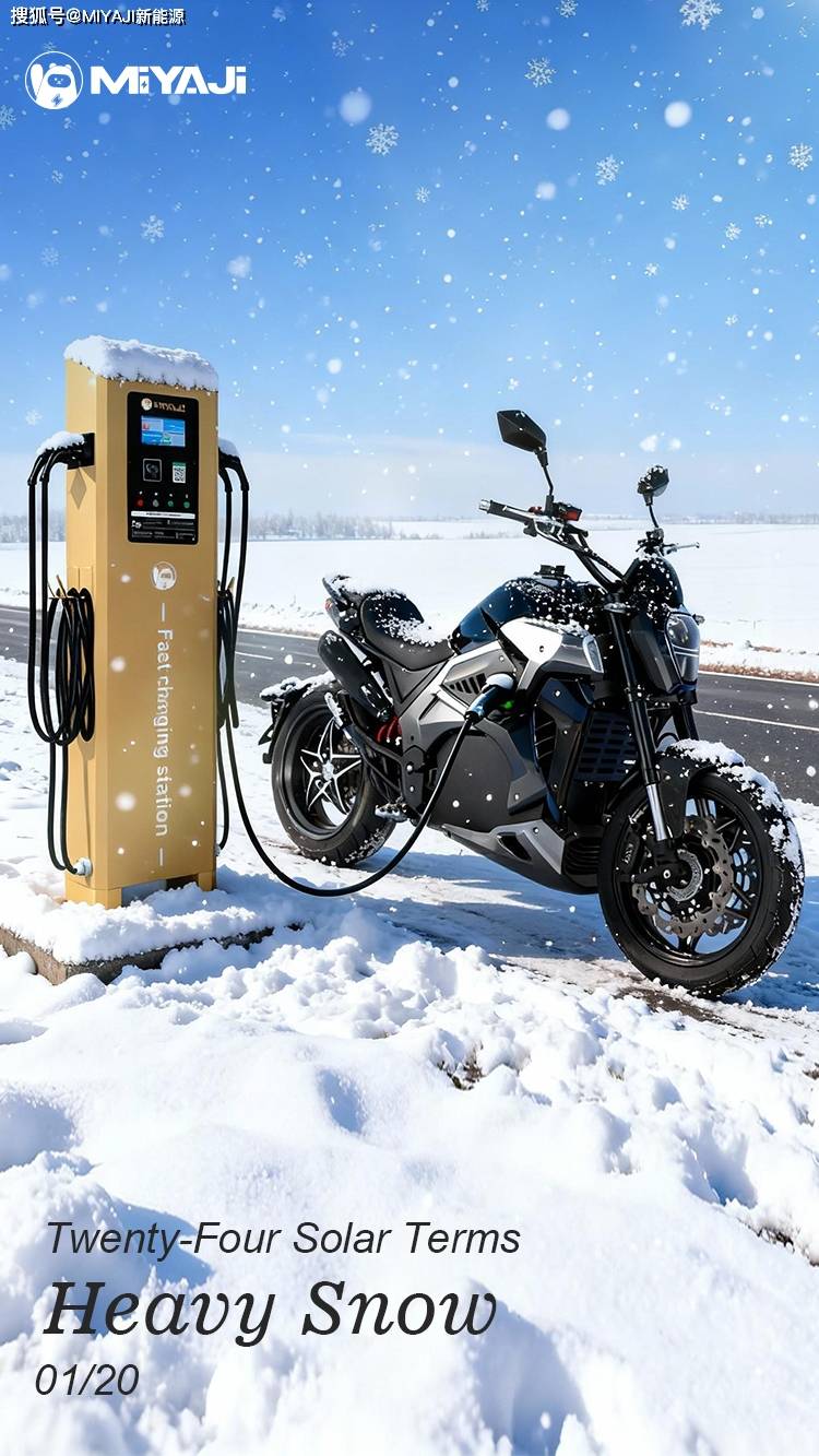 大寒至!骑遇大雪 | MIYAJI 陪你无畏风雪! The Great Cold has arrived! Riding through heavy snow | MIYAJI accompanies you through wind and snow! 大雪覆路,续航不降温⚡ MIYAJI 电动摩托 + 快充桩,低温环境稳定输出,30 分钟快充满电,陪你穿越风雪,奔赴每一场冬日之约。 Snow covers the road, but your range stays warm ⚡ MIYAJI e-motorcycle + fast charging station deliver stable performance in low temperatures, 30 mins quick charge to full power. Ride through snowstorms and keep your winter journeys going. 大寒是二十四节气中的最后一个节气,有“大寒迎年”的说法。斗指丑,太阳黄经达300°,于每年公历1月20日-21日交节。大寒同小寒一样,也是表示天气寒冷程度的节气,大寒是天气寒冷到极致的意思。 The Great Cold is the last of the twenty-four solar terms, and there is a saying that "the Great Cold welcomes the New Year." It occurs when the Big Dipper points to the direction of Chou (丑), and the sun's ecliptic longitude reaches 300°, falling on January 20th or 21st of the Gregorian calendar each year. Like the Lesser Cold, the Great Cold indicates the degree of coldness in the weather; it signifies the extreme of cold weather.