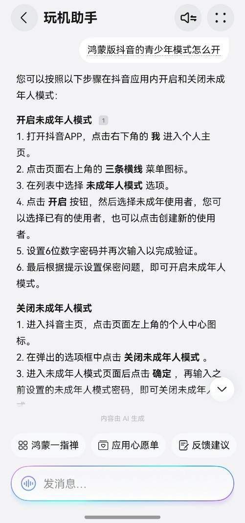 家里娃放寒假了,需要知道鸿蒙版抖音的青少年模式怎么开,小艺同样给出了详细路径,而且还贴心附上了关闭方法。