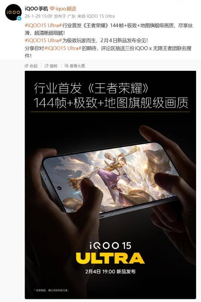 iQOO手机官方1月29日宣布,即将发布的iQOO 15 Ultra将行业首发支持《王者荣耀》144帧+极致画质+地图旗舰级画质三项同时开启。