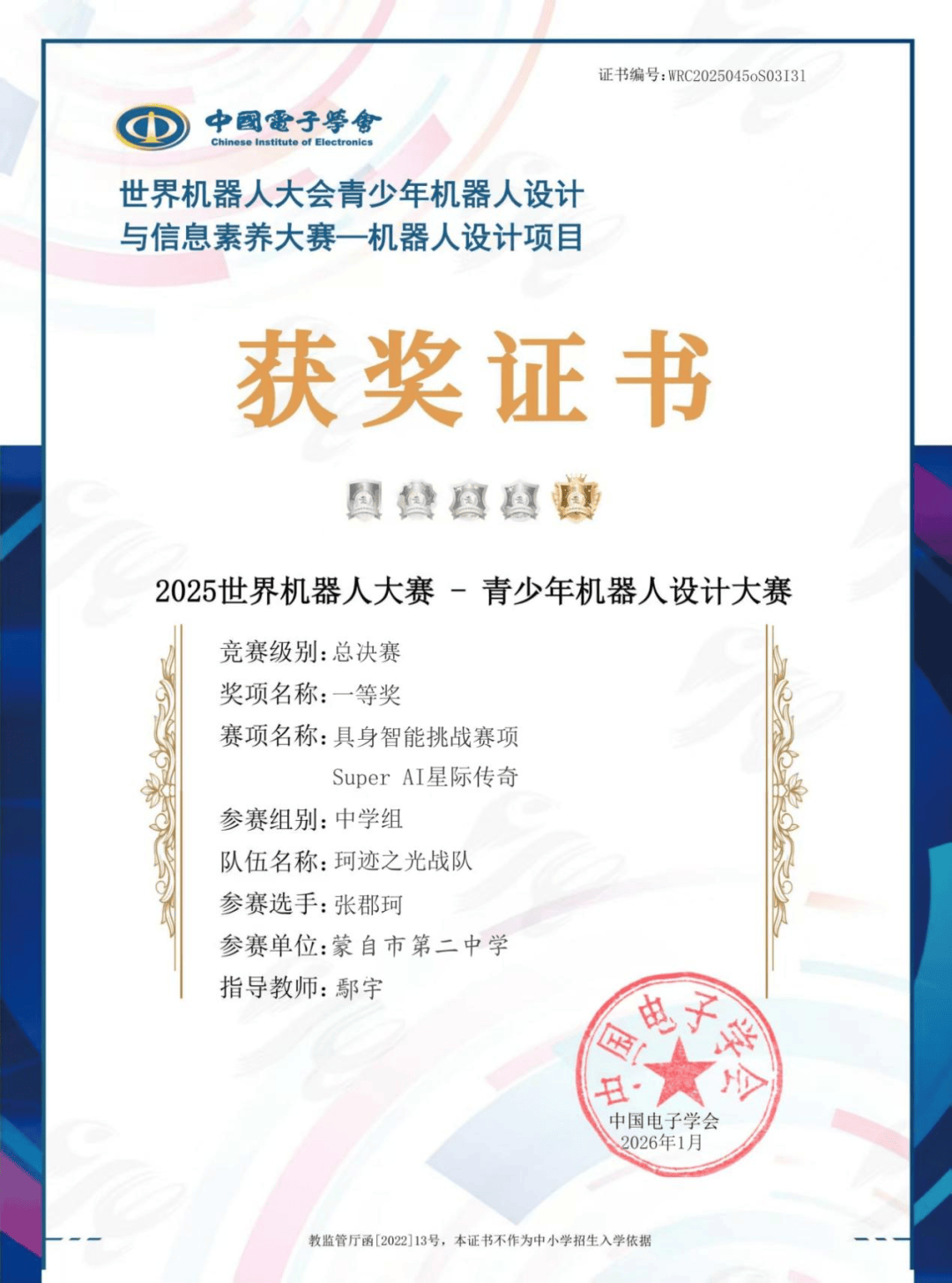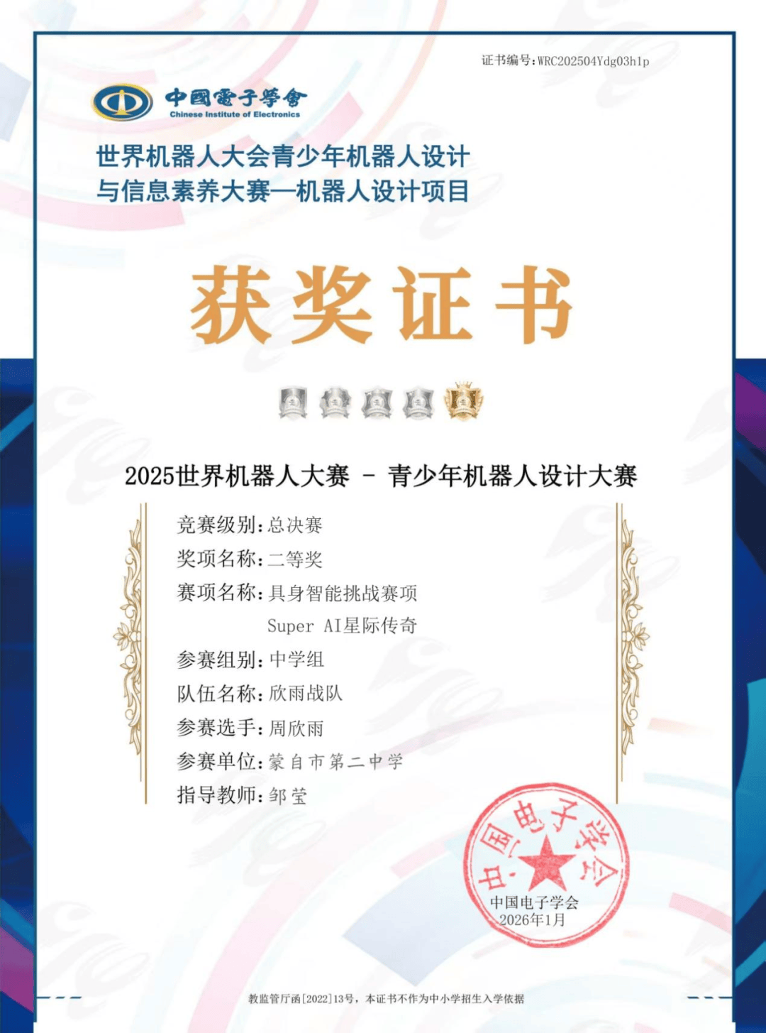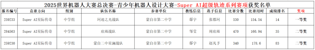 此次世界机器人大赛的比赛项目涵盖科研类、技能类和科普类三大方向,“Super AI 星际传奇”作为全球青少年机器人教育的重要赛事,旨在推动人工智能与机器人技术的普及与应用,培养学生创新思维、团队协作与解决问题的能力。蒙自市第二中学派出三支优秀战队参赛,凭借出色的创新能力、扎实的技术功底与稳定的现场发挥,珂迹之光战队的张郡珂同学全国排名14名荣获一等奖、欣雨战队的周欣雨同学全国排名35名荣获二等奖、蒙自二中星澜战队的赵凡予同学全国排名83名荣获二等奖,展现了蒙自二中学子在人工智能与机器人领域的卓越风采。