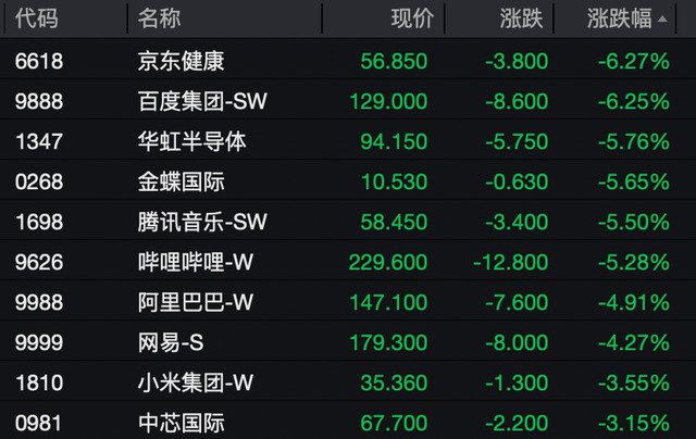 科网股方面,截至收盘,京东健康、百度跌超6%,腾讯音乐、哔哩哔哩跌超5%,阿里巴巴、网易跌超4%,同程旅行、快手、腾讯控股跌超2%,京东集团跌近2%。受此拖累,恒生科技指数跌2.91%至5211.50点,创下近五个月的调整新低。