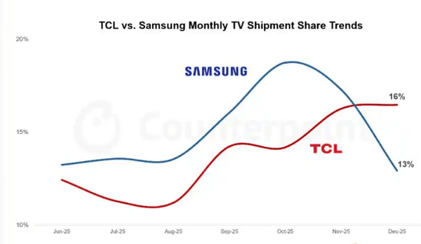 【CNMO科技新闻】全球电视市场格局迎来历史性转折。根据全球知名市场研究机构Counterpoint Research最新发布的数据,2025年12月,中国电视品牌TCL出货量同比增长10%,首次超越长期占据榜首的韩国巨头三星,登顶全球月度出货量冠军。这标志着自三星领跑行业以来,首次在单月被中国厂商反超,全球彩电行业的权力更迭正加速上演。