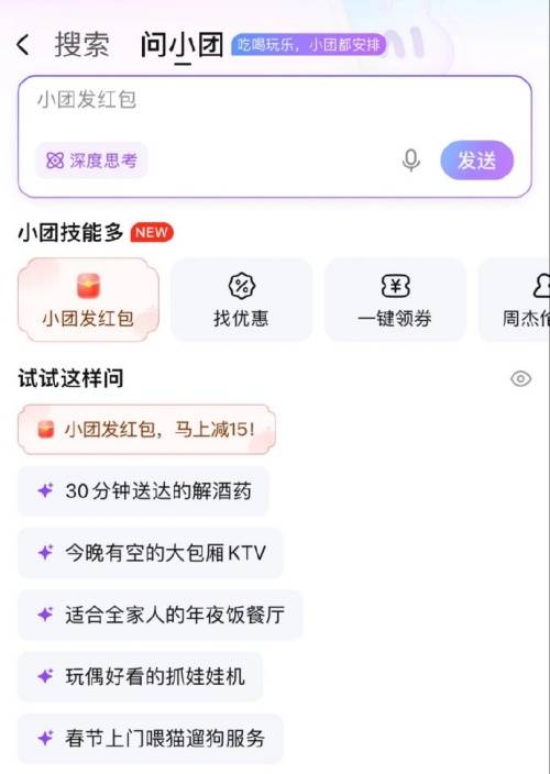 二是2月12日美团升级“问小团”AI管家。整个春节假期,用户美团App上提出本地吃喝玩乐相关问题,“问小团”便能快速进行深度思考,搜集美团上准确及时的商户与服务信息,并进行二次校验,结合真实用户评价,提供精准匹配需求且可交易的选择。同时,用户进入“问小团”春节专区,还可一键领取多种春节消费券,获取智能推荐的最优惠下单方案,覆盖外卖、闪购、餐饮堂食等场景。