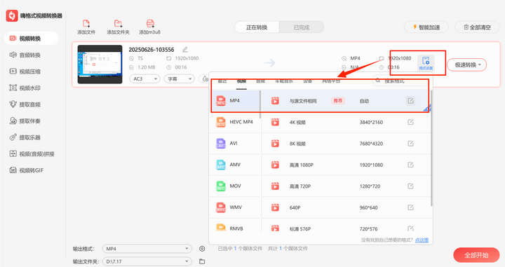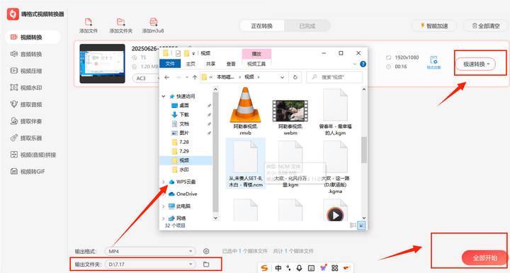 Step3:点击下方的输出文件夹,选择文件输出位置,最后点击“全部开始”或者“极速转换”按钮即可。