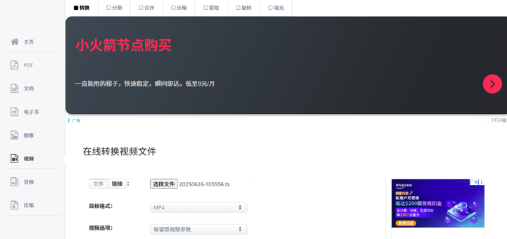 Aconvert在线工具无需下载,打开网页即可进行在线转换视频格式的操作,只需选择“转换”功能,接着选择添加TS文件,最后设置输出为“MP4”便可点击开始转换。输出的视频格式有多种选择,可以是MP4、AVI、MKV、WEBM、MOV、M4V、VOB或OGV等等。但需要注意提交的视频文件大小限制为1GB,并且该网站页面中常有广告弹出,需要用户谨慎辨别,免受广告误导。