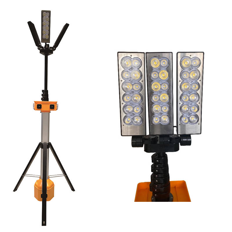 采用三灯头设计,可水平、垂直调节照射方向、照射角度,实现三个方向360°环照和单侧照明,可通过五节升缩杆实现灯头高度的调节,最大升起高度达到4m,可满足不同场所照明需求;