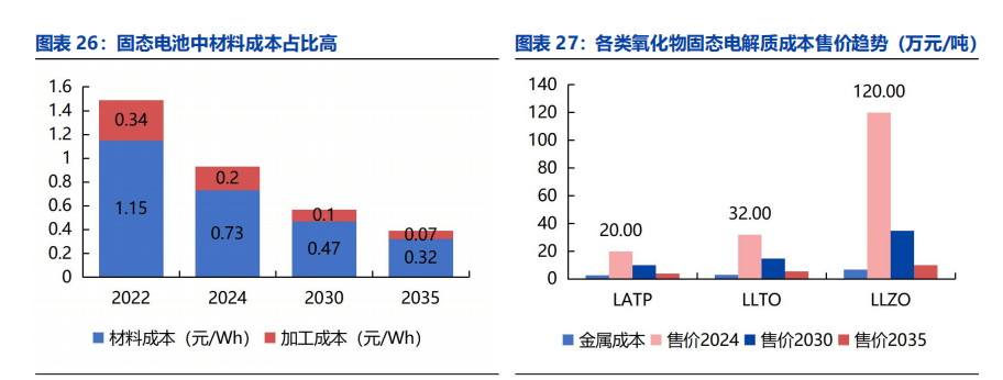 电解质售价呈下降趋势。氧化物中 LLZO 电解质的售价最高,2024 年为 120 万元/吨,预计 2035 年降至约 10 万元/吨。