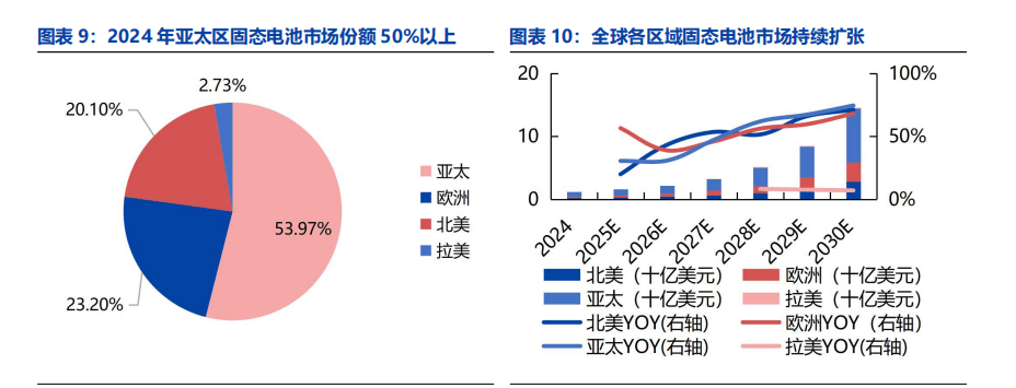 2024 年亚太区占据固态电池市场规模的 50%以上。受益于中国完整的锂电产业链、政策支持力度和新能源车等需求,亚太地区固态电池市场份额最高。