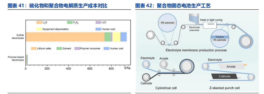聚合物电解质成本低廉、工艺成熟,但性能受限。聚合物电解质主要成本源于锂盐。聚合物电解质主要由锂盐和 PEO 聚合物等构成,相比于其他类型固态电解质,其成本极低。聚合物电解质工艺成熟,加工简便。聚合物电解质固态电池组装和传统锂电相近,聚合物电解质可通过溶液浇筑法,原位聚合法和静电纺丝/相转化法等方法制备。聚合物固态电解质离子电导率低、循环寿命短,并且能量密度和功率密度受限。