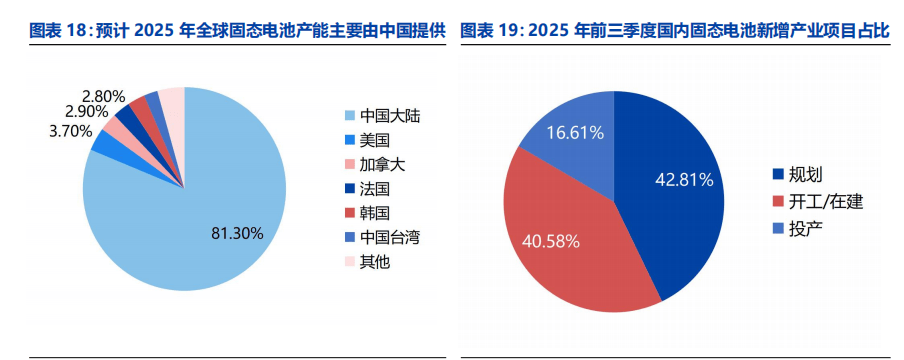 国内固态电池产业在建和规划产能高。2025Q1-Q3,共有 41 个固态电池产业项目更新动态,新增年产能总计 85.5GWh,其中新增规划产能约为 36.6GWh,在新增产业项目中占比达 42%以上。