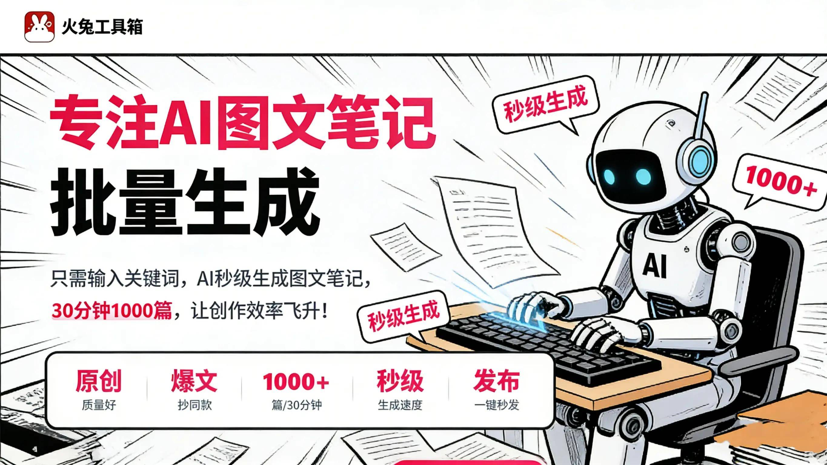 直到我挖到火兔工具箱,才算彻底摆脱这种内耗——它不只是简单的文案生成工具,更是深耕小红书运营的全能助手,结合上万发布实战场景打磨,连续6个月突破自研多模型融合技术,把AI创作的灵活度和运营的实用性拉满,新手也能轻松出爆款。