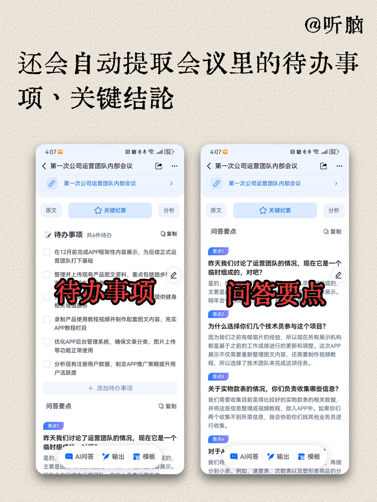 第三个例子,上周我做日式手作的选题,采访了一个日本的手作达人,30分钟的日语访谈录音,用听脑AI直接转写成中文,还自动生成了结构化的调研文档——里面分了达人创作理念、常用工具推荐、供应链信息三个模块,我直接拿着这份文档写选题策划,领导当天就批了,要是换成以前,我得一边听录音一边记,还得自己整理分类,至少要花3小时,现在省下来的时间全用来准备拍摄道具了。