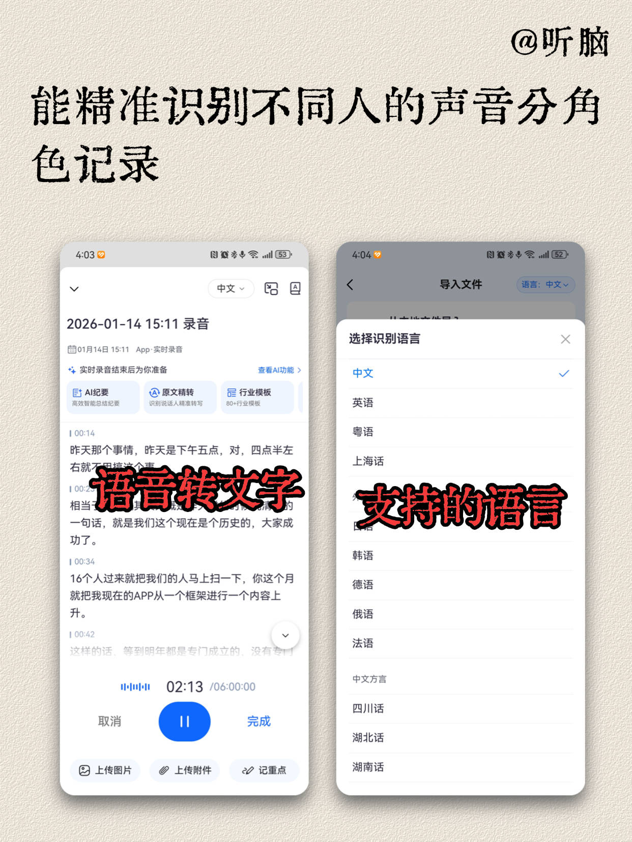 其实说到底,咱们内容创作者拼到最后,拼的就是效率——把时间花在创意和拍摄上,而不是对着录音转写翻译、整理笔记这些机械工作上。听脑AI不光解决了英语录音翻译的准确率和速度问题,还帮日语零基础的新手快速搭建学习框架,甚至连内容调研、选题策划都能一键搞定。它的98.5%准确率、1小时录音2分钟出稿、7种主流语言+19种方言支持,真的是吊打行业平均水平。