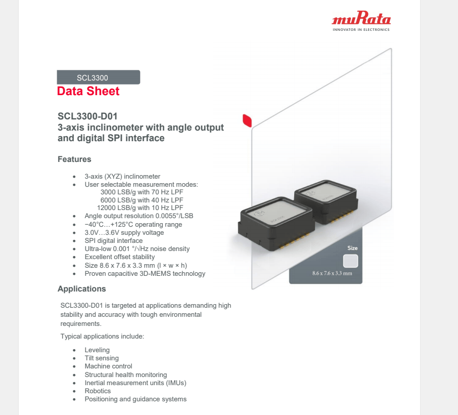 SCL3400-D01是村田推出的高精度双轴倾角传感器,支持±90°测量,具备低噪声、高分辨率和宽温范围,适用于结构监测和工业应用。