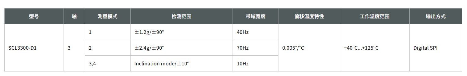 SCL3400-D01是村田(Murata)推出的高精度双轴数字倾角传感器,具有±90°测量范围和全角度检测能力。该传感器提供两种可选模式:±30°(10Hz滤波)和±90°(40Hz滤波),支持不同动态响应需求。采用SPI数字接口,分辨率达32768LSB/g,噪声密度低至0.0009°/√Hz,零偏漂移≤0.05°,确保高精度测量和长期稳定性。工作温度范围-40℃至+85℃,供电电压3.0-3.6V,采用8.6×7.6×3.3mm紧凑封装,适用于结构监测、平台调平、IMU和导航系统等工业应用。