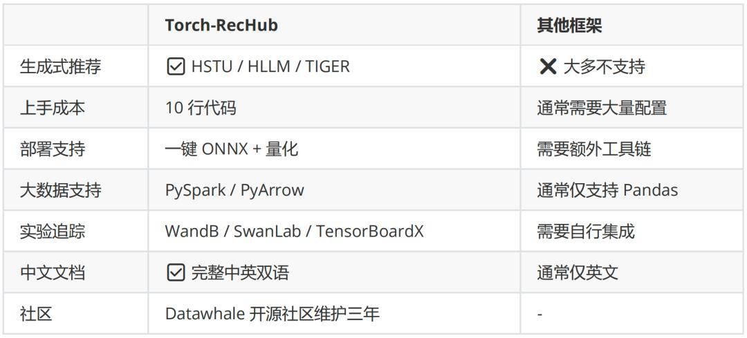 很多框架也号称支持几十个模型,但Torch-RecHub 三年持续迭代,在模型之外积累了一整套工程能力: