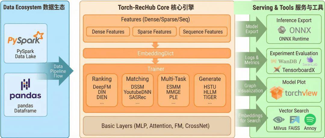 我们想做的事情很朴素——把深度推荐系统的主流模型用 PyTorch 统一实现一遍,统一接口、统一流程、开箱即用,让大家把精力花在理解模型和业务上,而不是工程对齐上。