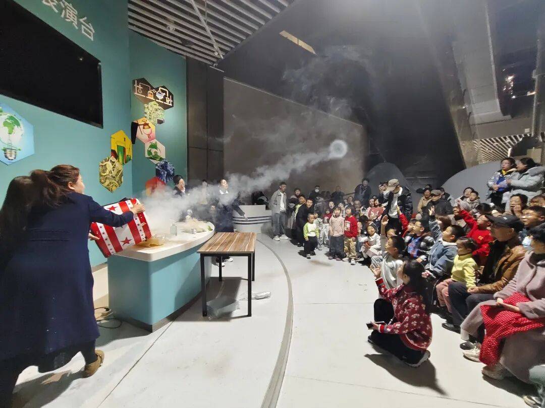 本次活动紧扣春节民俗特色,精心设置了多个精彩绝伦的实验环节,每一个都让人惊叹不已。在液氮极低温实验中,科普辅导员将蔬菜放入-196℃的液氮中,瞬间,蔬菜被急速冰冻,变得坚硬无比。这一直观的展示,让观众们深刻感受到了极低温的物理特性,仿佛打开了一扇通往神秘低温世界的大门。无字天书显色实验则充满了神秘色彩,科普辅导员利用酚酞遇碱显色的原理,将原本空白的纸张变成了写满祝福的“天书”,引得观众们纷纷发出惊叹和好奇的询问。结合包头本土特色,展示了稀土发光材料的独特魅力。这些材料发出绚丽多彩的光芒,如同夜空中的繁星,让观众们领略到了科技的神奇与家乡的骄傲。静电“福花满天”实验更是将现场气氛推向了高潮,科普辅导员借助静电排斥现象,让一朵朵“福花”在空中翩翩起舞,演绎出了一幅唯美壮观的画面,寓意着新的一年福气满满、好运连连。而环保空气炮实验则充满了趣味性和互动性,科普辅导员用空气炮送出新春祝福,巨大的气流冲击着前方的目标,引得观众们阵阵欢呼,让科学知识在欢声笑语中深深印入大家的脑海。