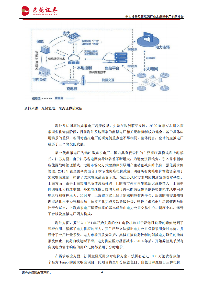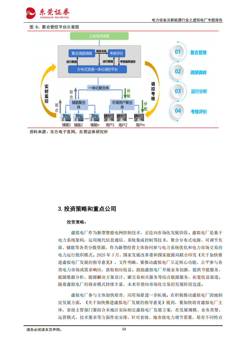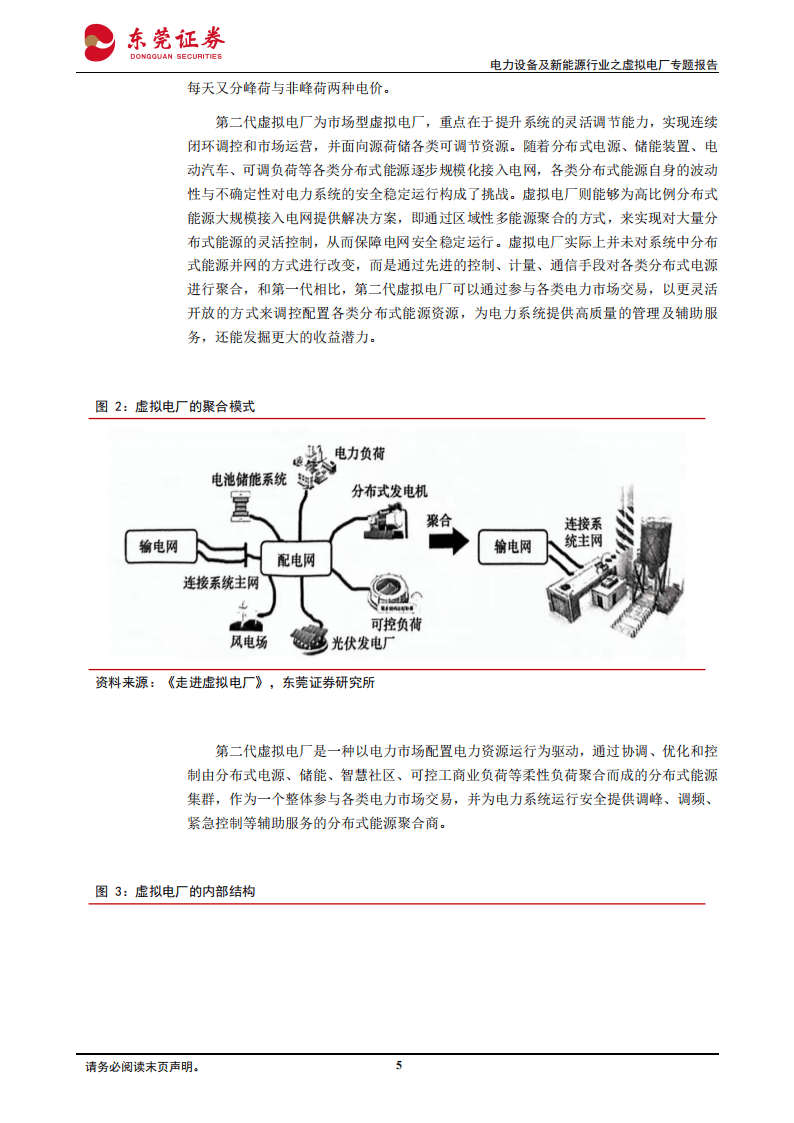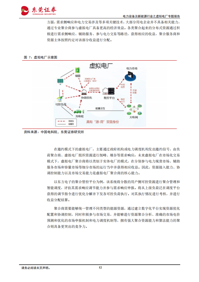 本报告聚焦电力设备及新能源行业的虚拟电厂领域,指出虚拟电厂作为新型智能电网控制技术,正逐步迈向市场化发展阶段,其是依托电力系统架构,融合信息通信、系统集成控制等技术,聚合分布式电源、可调节负荷、储能等分散资源,参与电力系统优化和市场交易的电力运行组织模式,能为电网提供调峰、调频等调节服务,在电力保供、新能源消纳、电力市场完善方面意义重大。