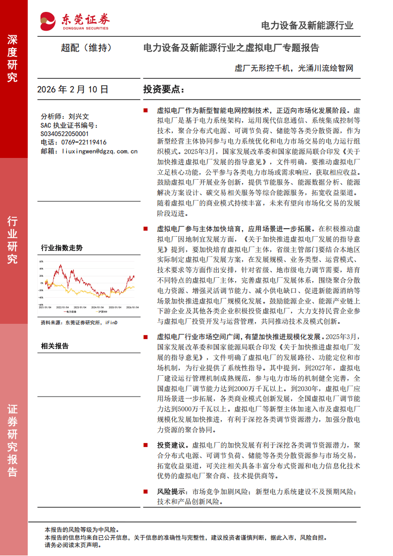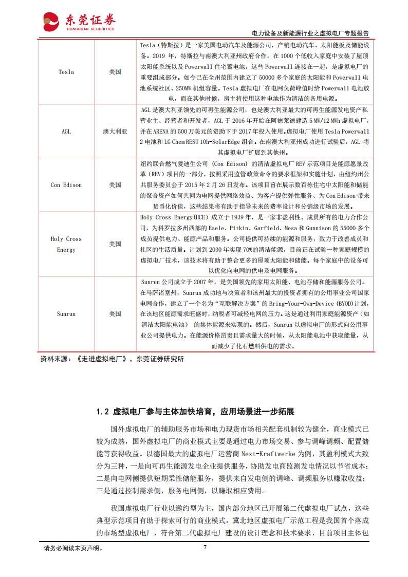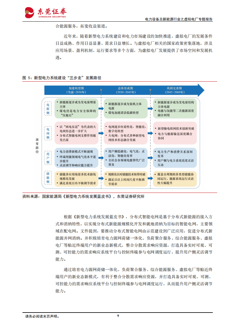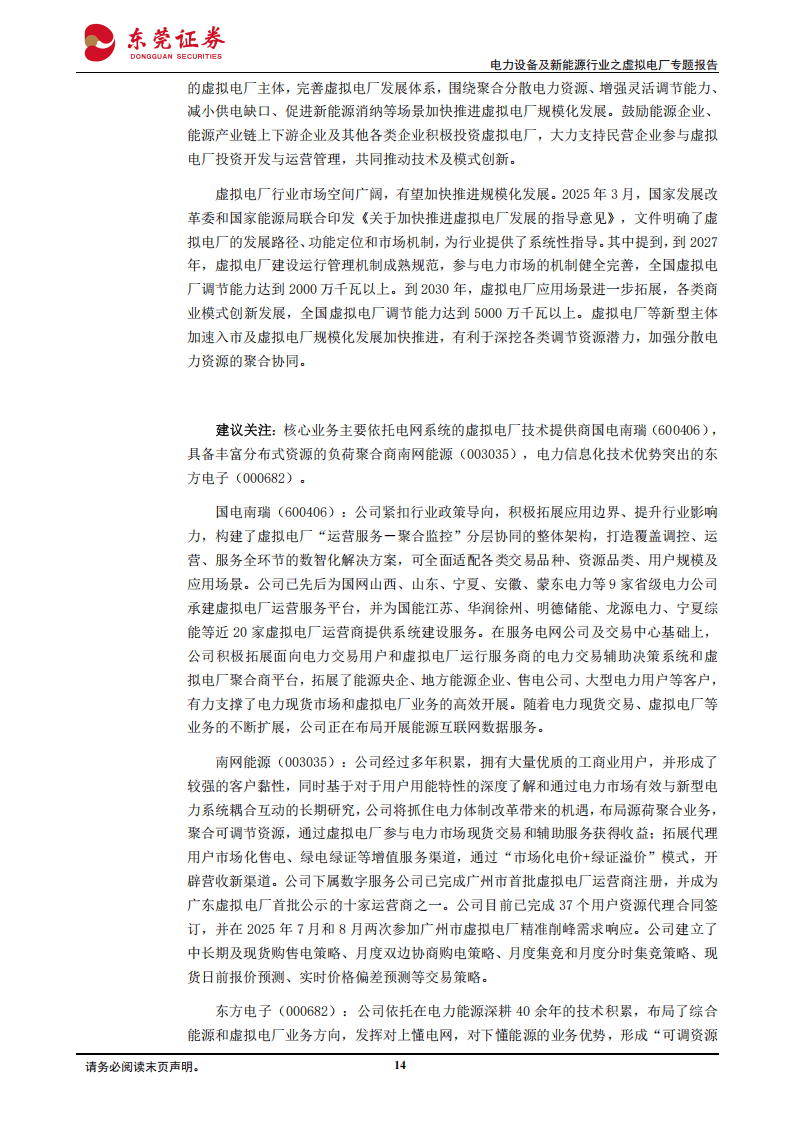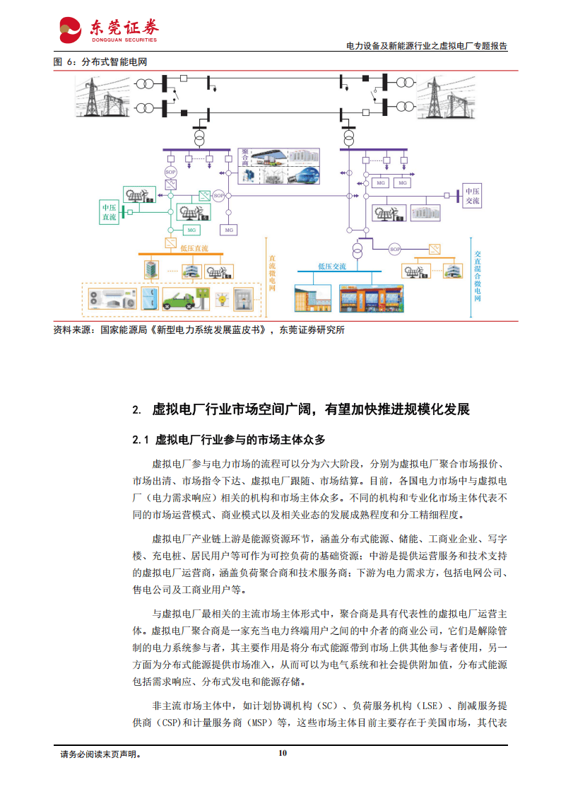 本报告聚焦电力设备及新能源行业的虚拟电厂领域,指出虚拟电厂作为新型智能电网控制技术,正逐步迈向市场化发展阶段,其是依托电力系统架构,融合信息通信、系统集成控制等技术,聚合分布式电源、可调节负荷、储能等分散资源,参与电力系统优化和市场交易的电力运行组织模式,能为电网提供调峰、调频等调节服务,在电力保供、新能源消纳、电力市场完善方面意义重大。