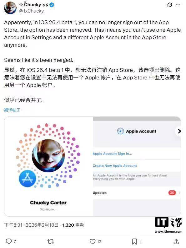 后续有用户发现,苹果在 iOS 26.4 Beta 1 测试版本中调整了账户切换流程, 移除了 App Store 原有的账户退出功能,现在必须转到设置里才能切换账户。