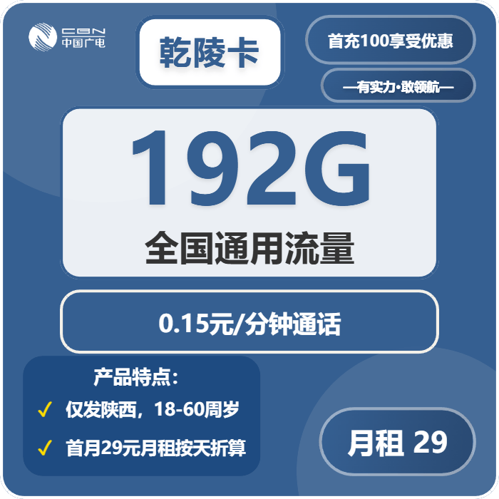 乾陵卡的基础原套餐是29元/月,仅包含30G全国通用流量,加上0.15元/分钟的全国通用通话,这个基础套餐流量偏少,日常使用不够。激活当月强充100元后,就能享受优惠套餐,29元/月包192G全国通用流量,依旧是0.15元/分钟通话,流量直接翻6倍,性价比瞬间拉满,这也是乾陵卡最核心的资费优势。