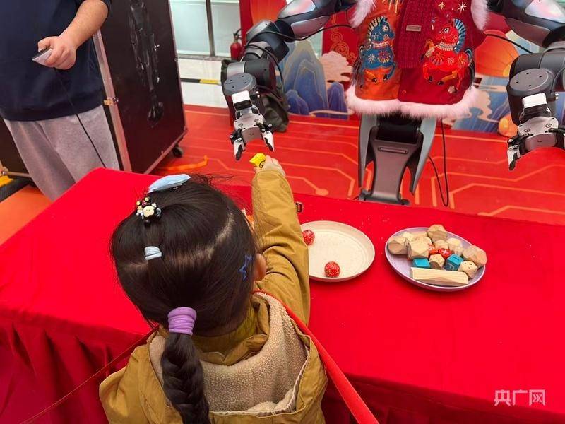 “赛博瑞狮”退场,路过千寻智能“小墨”展台。它正在庙会现场串“糖葫芦”。“小墨”要先通过机械臂稳稳抓起一根细长的竹签,再通过视觉识别,精准定位一颗颗圆润饱满的山楂,调整角度后轻柔且有力地将竹签依次穿过山楂。它还可以复刻人类搭积木的过程,将形态各异的积木,逐块垒砌。