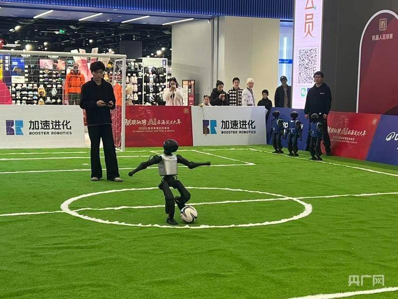 加速进化市场负责人任子歆介绍:“只要它开始了,它就是自己来进行了。比如谁负责守门,谁负责传球和射门,这些都是它们进行群体自主决策之后进行的,然后再进行运动控制,进行踢球、传球、射门这些动作。今年其实跟去年也有些区别,去年我们只有一款一米二五左右的机器人,今年带来的是新出的产品,大概不到一米的身高,但是它力量很大,你看刚才那一脚射门,就把那个挡板都踢得‘梆梆’的,它其实是按照距离来判断下脚的力度。机器人足球是一个很好的测试场,它也是检验AGI、AI发展速度的一个场景。”