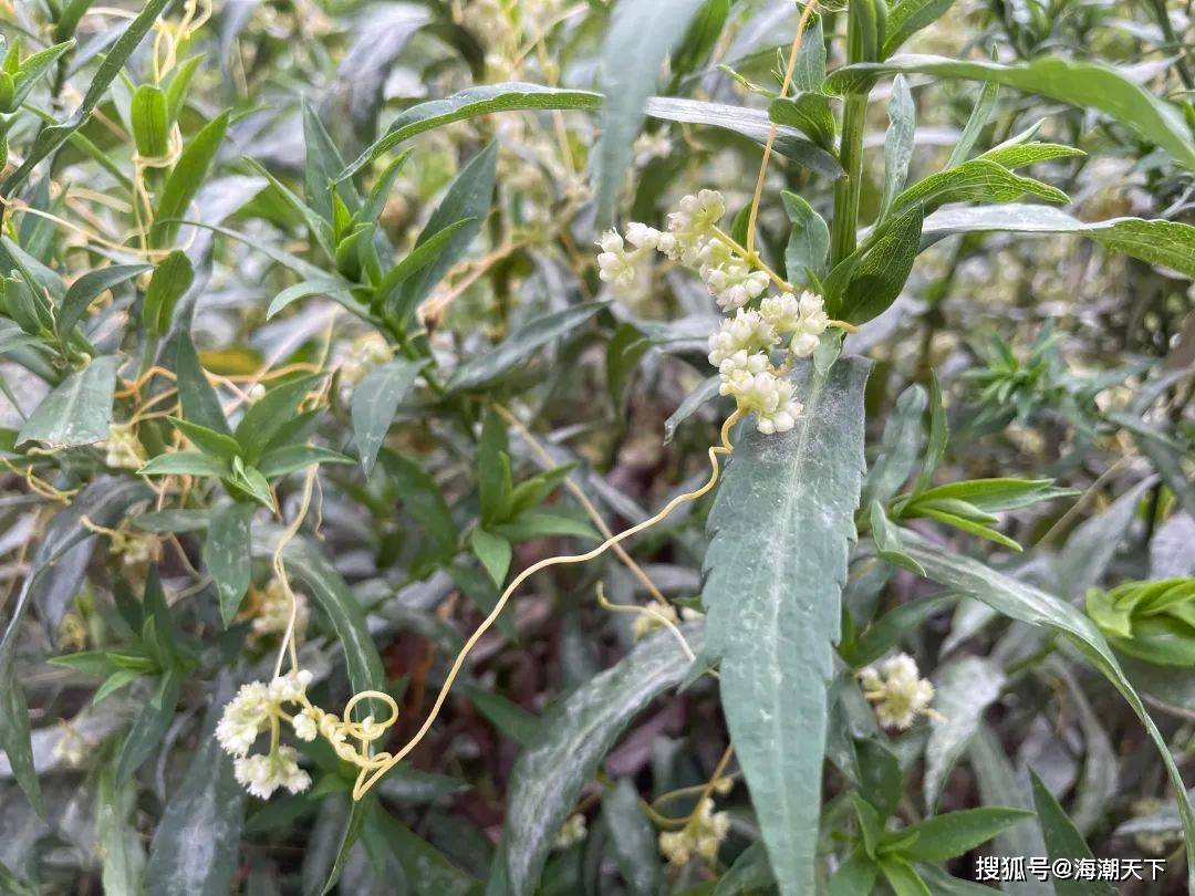 菟丝(Cuscuta chinensis var. carinata (R. Br.) Engelm.),又称黄丝藤、金丝藤,是一种著名的茎寄生植物。它主要依靠吸器从寄主植物中获取营养,而不是通过自身的光合作用。因此,菟丝在自然进化过程中失去了大多数植物所必需的叶片和根,只保留了不能进行光合作用的茎。摄影:Linda(摄于北京圆明园) ©海潮天下(Marine Biodiversity)