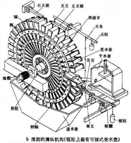 首先,我们了解一下它的动力机构。枢轮上有72条辐,托着36个水斗。枢轮顶部和边上安装了世界上第一个擒纵装置。在枢轮旁装有一组两级漏壶。壶水注入水斗,斗满时,枢轮即往下转动。但因擒纵器的控制,使它只能转过一个斗。这样就把变速运动变为等时的间歇运动,使整个仪器运转均匀。枢轮下有退水壶。在枢轮转动中各斗的水又陆续回到退水壶里。然后,再由打水人把水补回去。这就是“水运”的由来。